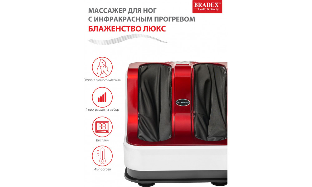 Массажер для ног Блаженство Люкс с инфракрасным прогревом – революционная универсальная система, которая сочетает в себе синергию восточных массажных техник и современных открытий в области рефлексологии. Три основных программы и три режима массажа воздействуют на рефлекторные зоны ног, что благотворно сказывается на работе всего организма в целом. Роликовый массаж Шиацу с функцией инфракрасного прогрева стимулирует кровообращение и лимфодренаж в конечностях, уменьшает отечность, усиливает эффект расслабления, оказывает иммуностимулирующее действие. Боковые валики выполняют глубокий компрессионный массаж сразу нескольких зон: стоп, лодыжек, икр. Проходят судороги, снимается общее напряжение. Массажер также оснащен дополнительными массажными роликами шиацу в области икр для разминающего массажа уставших, забитых мышц. Откидная подставка для изменения угла наклона обеспечивает максимальный комфорт ног. Предусмотрен ручной режим для индивидуальной настройки программы массажа. Преимущества: ● Массаж стоп и аэромассаж икр. ● Эффект ручного массажа. ● 4 программы на выбор. ● 2 мотора с функцией подогрева до 50 ℃.